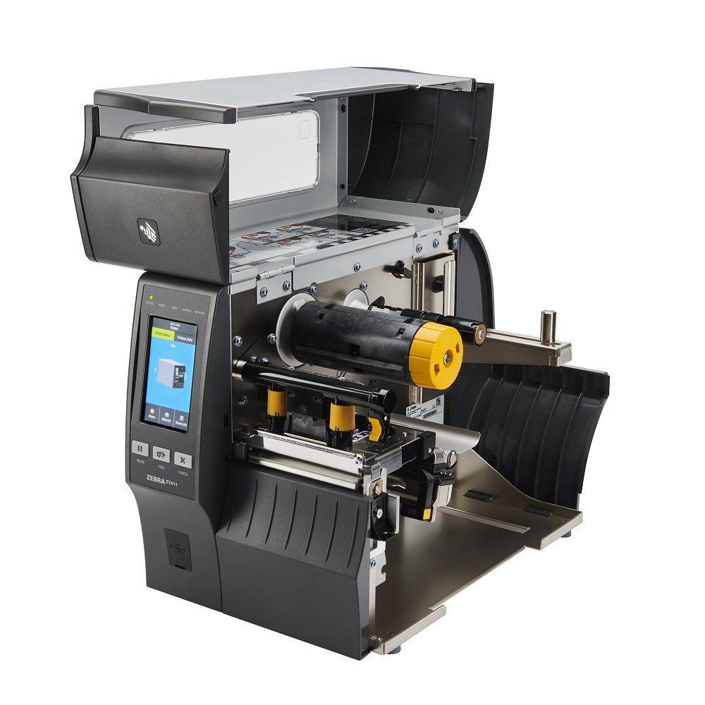-Impressora de etiquetas Semi-industrial Zebra ZT411, com sistema de corte, transferência térmica em 203 dpi e 104mm de largura de impressão, linguagem ZPL e EPL, 64Mo de memória Flash com RTC(Real Time Clock), porta USB, serial, Ethernet 10/100 e Bluetooth 2.1