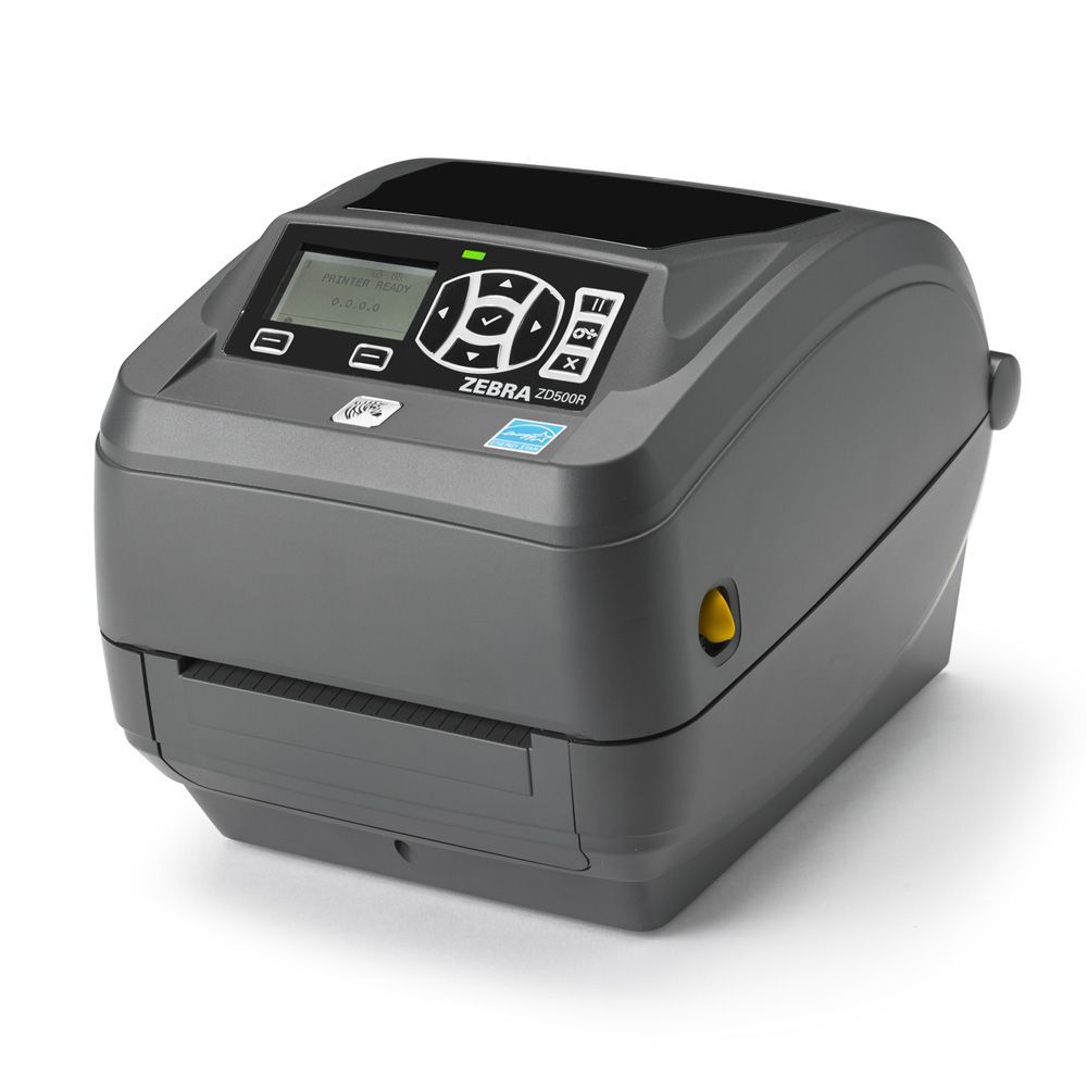 -Impressora de Secretária Zebra ZD500 RFID com codificador UHF, transferência térmica em 203 dpi e 104mm de largura de impressão, com a opção sitema de corte, interface Wifi 802.11a/b/g/n, Bluetooth v3.0, serial, paralela, USB e Ethernet, 256Mo de memória flash e 128Mo de SDRAM.