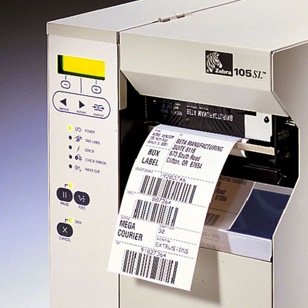 -Impressora de etiqueta semi-industrial Zebra 105SL, transferência térmica em 300 dpi e 104mm de largura de impressão, linguagem de programação ZPL, 4Mo de Memória Flash com rede Zebranet rádio (não incluído) e Sensor de separação de etiquetas (transmissivo).