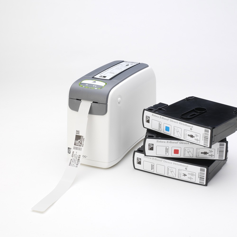 -Impressora para pulseira de identificação Zebra HC100 300 dpi, transferência térmica, ZPL II, XML com memória Flash 8Mo, SDRAM 16Mo, sem RTC, cabo europeu e UK com FONT Suisse 721, porta RS232, USB e Ethernet .