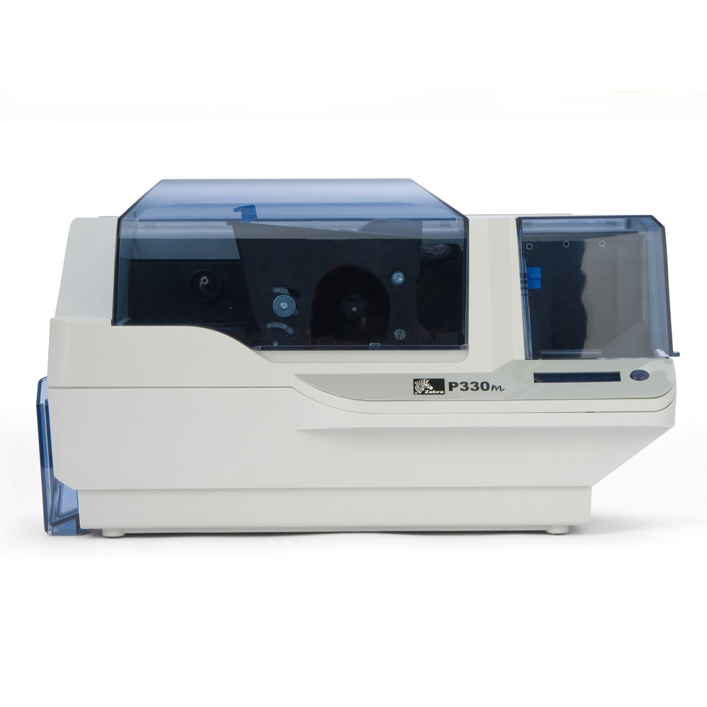 -Impressora de cartão monocromático alto desempenho P330m uma face com alimentador de 100 cartões, ecrã LCD, 16 caracteres, estação de contato com acoplador para codificação do cartão com chip (cartões 0,762 mm) com conexão Ethernet e USB.
