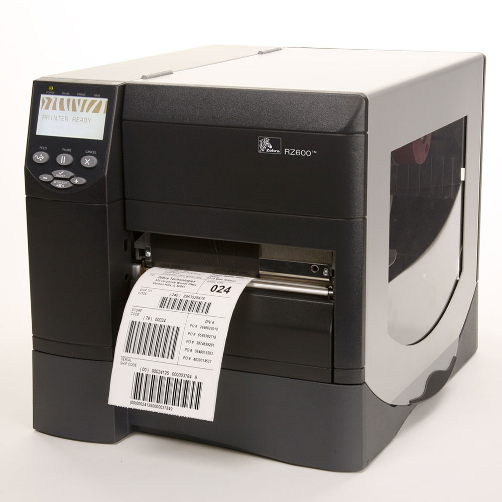 -Impressora semi-industrial Zebra RZ600 com codificador RFID (UHF), transferência térmica em 300 dpi e 168mm de largura de impressão, ZPL, 8Mo de memória Flash, interface USB, serial, paralela.