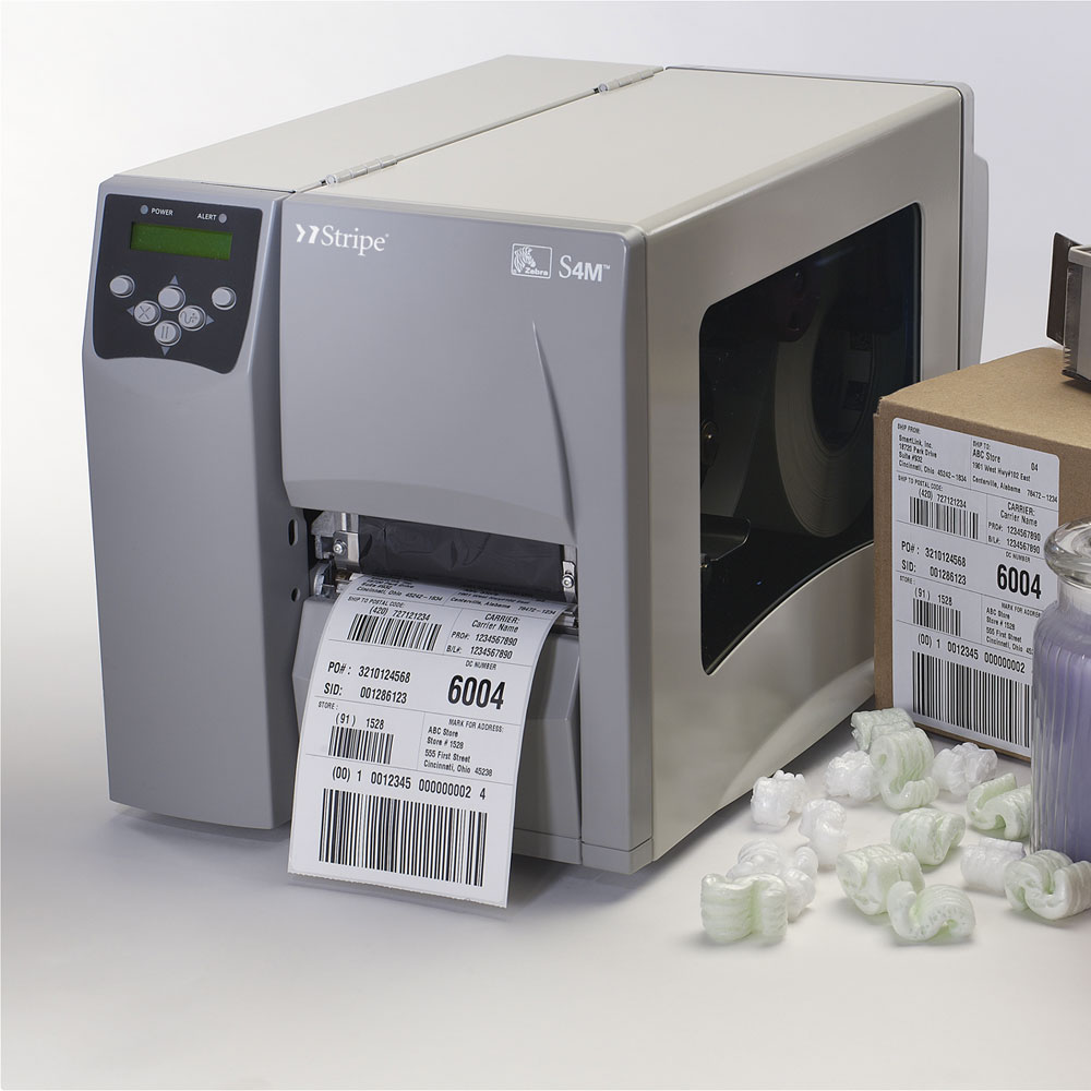 -Impressora de etiqueta semi-industrial Zebra S4M, transferência térmica em 203 dpi e 104mm de largura de impressão, linguagem de programação EPL, 4Mo de Memória Flash com Zebranet b/g rádio e opção RTC (Real Time Clock).